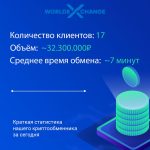 Статистика за сегодня: Количество клиентов: 17 Объём: ~32.300.000₽ Среднее время обмена: ~7 минут Оставить заявку на обмен: